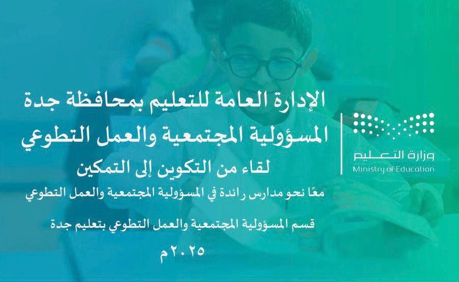 نظّم تعليم جدة ممثلًا في قسم المسؤولية المجتمعية والعمل التطوعي اليوم، اللقاء الافتراضي “من التكوين إلى التمكين”، تحت شعار " معًا نحو مدارس رائدة في المسؤولية المجتمعية والعمل التطوعي" والذي استهدف مديري ومديرات المدارس ومنسقي ومنسقات مسارات المسؤولية المجتمعية والعمل التطوعي.