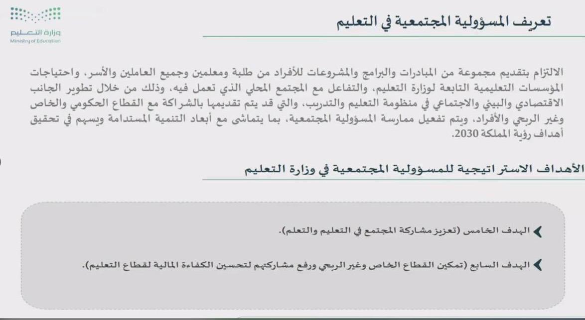 كما ركّز اللقاء على إبراز دور التعليم في المسؤولية المجتمعية والعمل التطوعي، وتمكين المدارس من إطلاق مبادرات نوعية ذات أثر مستدام، وتعزيز الشراكات بين التعليم والقطاعين الخاص وغير الربحي، توحيدًا للجهود نحو تحقيق مستهدفات رؤية 2030 في التنمية البشرية.