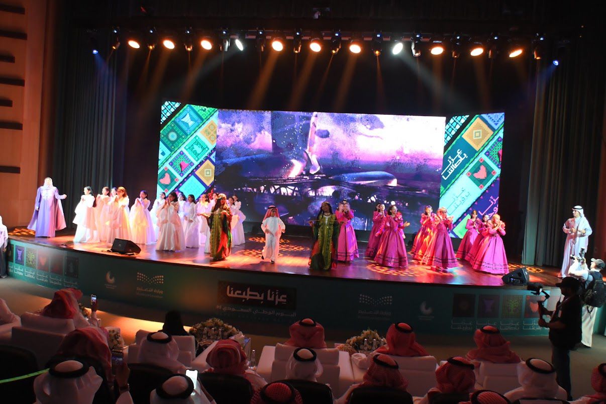 عقب ذلك شاهد الحضور استعراضاً فنيًا مسرحيًا من أداء طلاب وطالبات تعليم جدة تضمن أوبريت "عزّنا بطبعنا"، يحكي مشاعر منسوبي ومنسوبات المجتمع التعليمي بمناسبة اليوم الوطني.