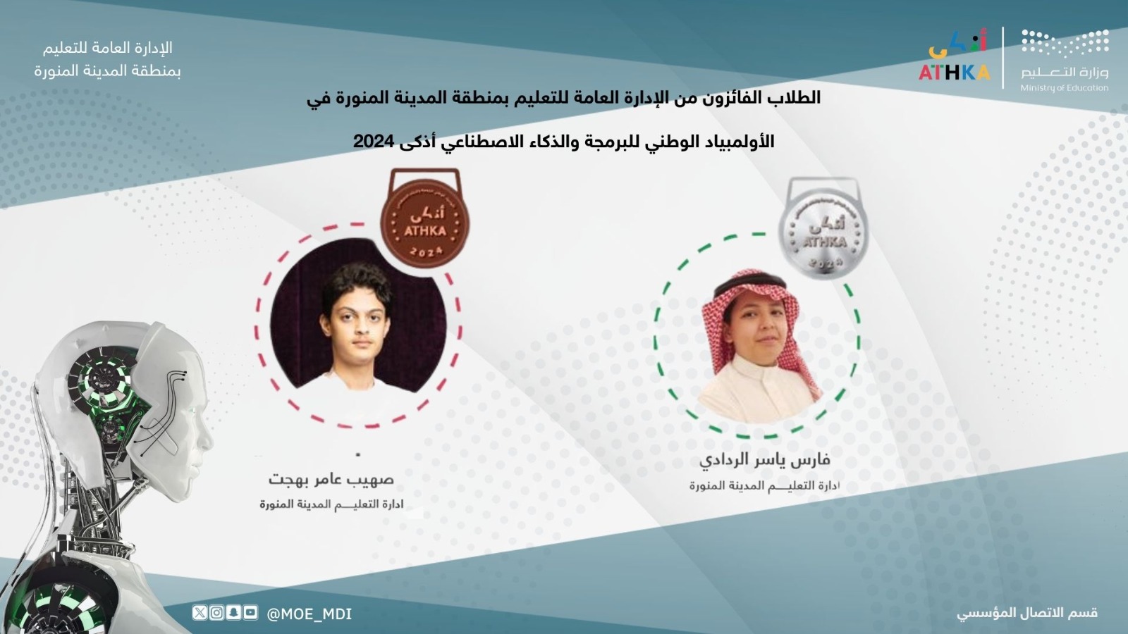 الاتصال المؤسسي … حققت الإدارة العامة للتعليم بمنطقة المدينة المنورة (المركز الأول) في الفئة الثالثة للمناطق الأعلى تسجيلاً على مستوى المملكة بتسجيل 30.000 طالب وطالبة في الأولمبياد الوطني للبرمجة والذكاء الاصطناعي أذكى 2024 ، كما حقق الطالب فارس ياسر الردادي من متوسطة العلوم الشرعية الميدالية الفضية في الأولمبياد وحصل الطالب صهيب عامر بهجت من ثانوية الخندق الأهلية على الميدالية البرونزية.
