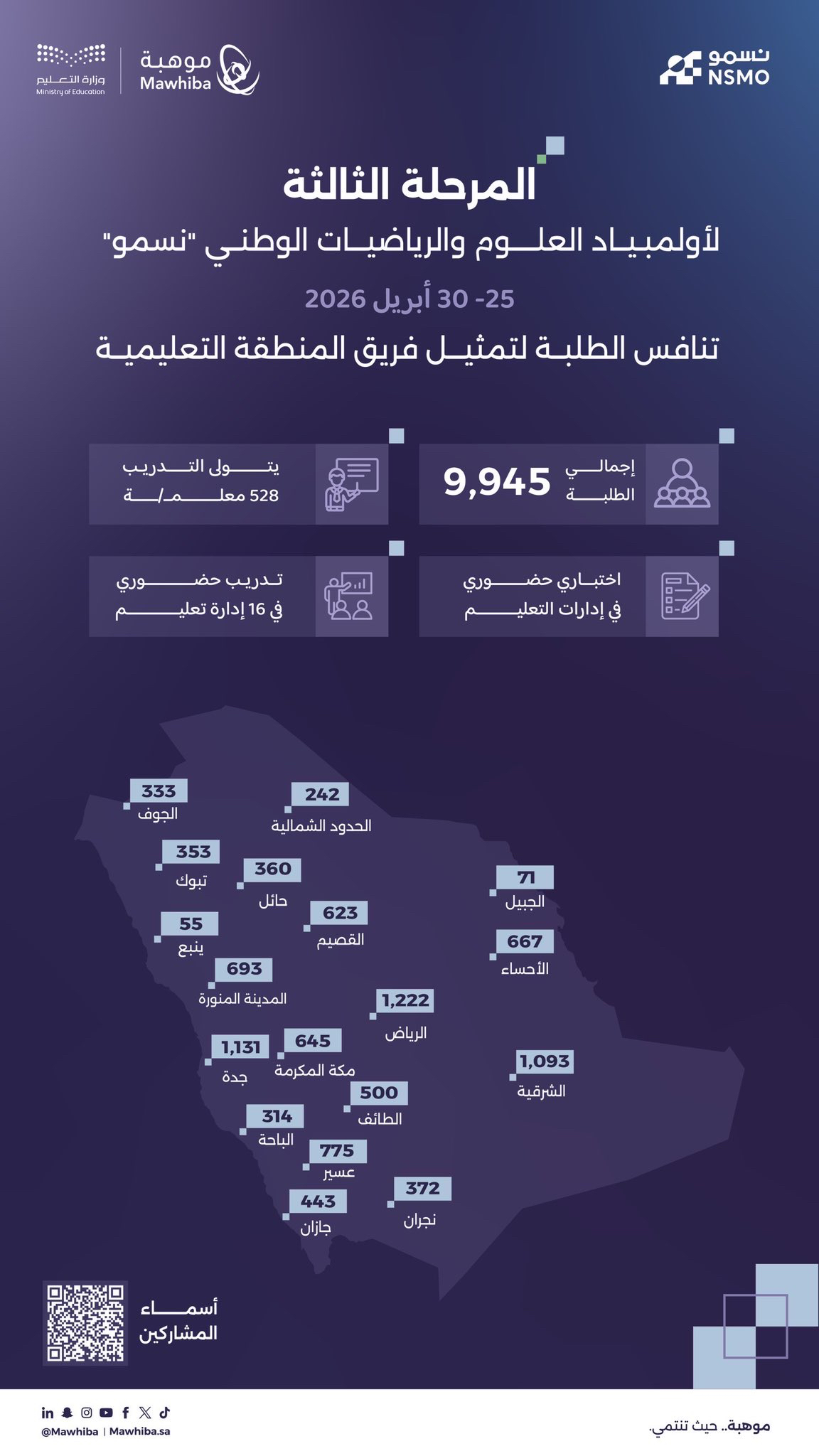 وتشهد المرحلة الثالثة من أولمبياد العلوم والرياضيات الوطني "نسمو" تنافس الطلبة لتمثيل فرق المناطق التعليمية، عبر برنامج متكامل يبدأ بتدريب حضوري في (16) إدارة تعليمية، بإشراف (528) معلمًا ومعلمة تم تأهيلهم مسبقًا، وتُختتم هذه المرحلة باختبار حضوري في إدارات التعليم.