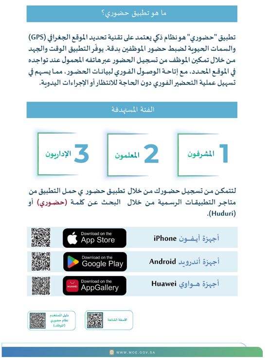 نظام يعتمد على تقنية تحديد الموقع الجغرافي (GPS) والسمات الحيوية لضبط حضور الموظفين بدقة، ويوفّر التطبيق الوقت والجهد من خلال تمكين الموظف من تسجيل الحضور عبر هاتفه المحمول عند تواجده في الموقع المحدد، مع إتاحة الوصول الفوري لبيانات الحضور، مما يسهم في تسهيل عملية التحضير الفوري دون الحاجة للانتظار أو الإجراءات اليدوية.